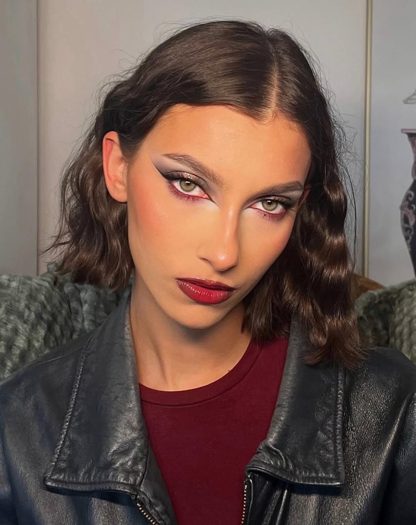 This look feels intense, editorial, and undeniably grown. The deep wine lips anchor the face, while the structured eye makeup gives a strong, almost cinematic presence. It recalls late-90s fashion editorials where makeup was about power and attitude, not softness. There’s a quiet drama here that feels confident and intentional.