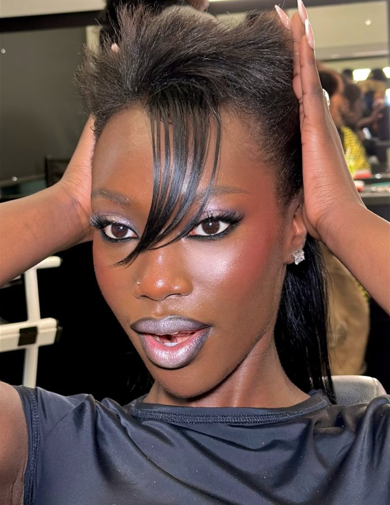 This look is pure 90s nostalgia, blending silver-grey eyeshadow with softly flushed cheeks and glossy lips. The headband adds an unmistakable early-90s touch, making the whole aesthetic feel relaxed yet styled. It’s gentle, balanced, and quietly glamorous, like a beauty moment you’d see backstage rather than on the runway.