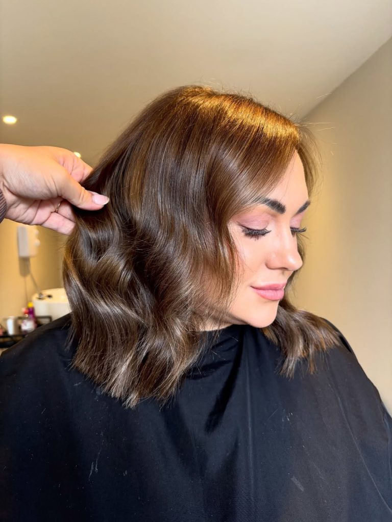 This warm brunette look combines the best qualities found in nature—soft waves that cascade down with subtle highlights and subtle shine with sleek side-swept hair that screams 90s timeless chic. This look works perfectly on fine hair and wavy hair types that need that effortless flow.
