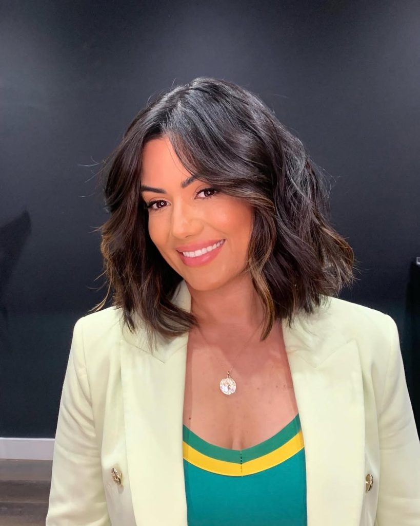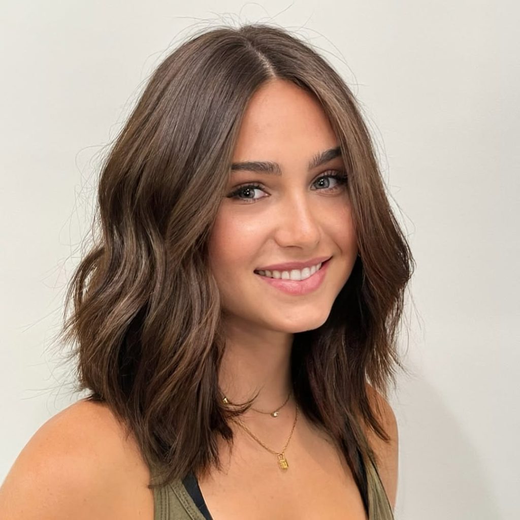 The wavy dark brown lob is the epitome of effortless style. The loose and wavy look with side parting flatters the face shape with ease, as the dark color ensures added depth and overlying sheen.