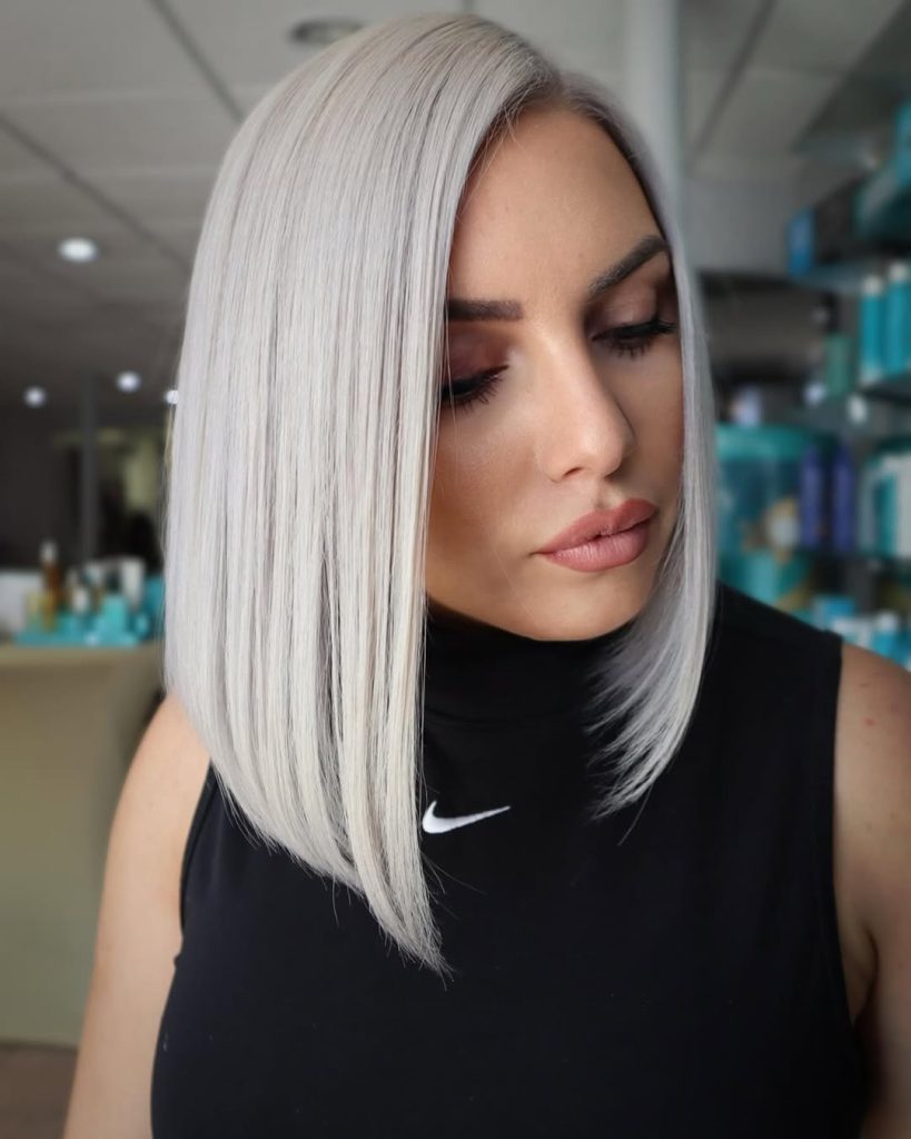 This straight blonde bob is all about precision-cut perfection. The defined lines and the lighter highlighting on the forehead result in an impeccable face-framing effect that enhances the face greatly. The bold contrast between the lighter hair color and darker roots works wonders in terms of giving it depth.