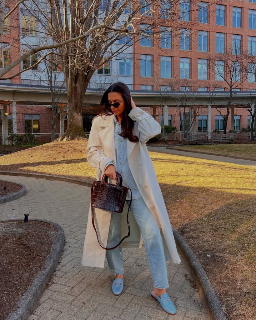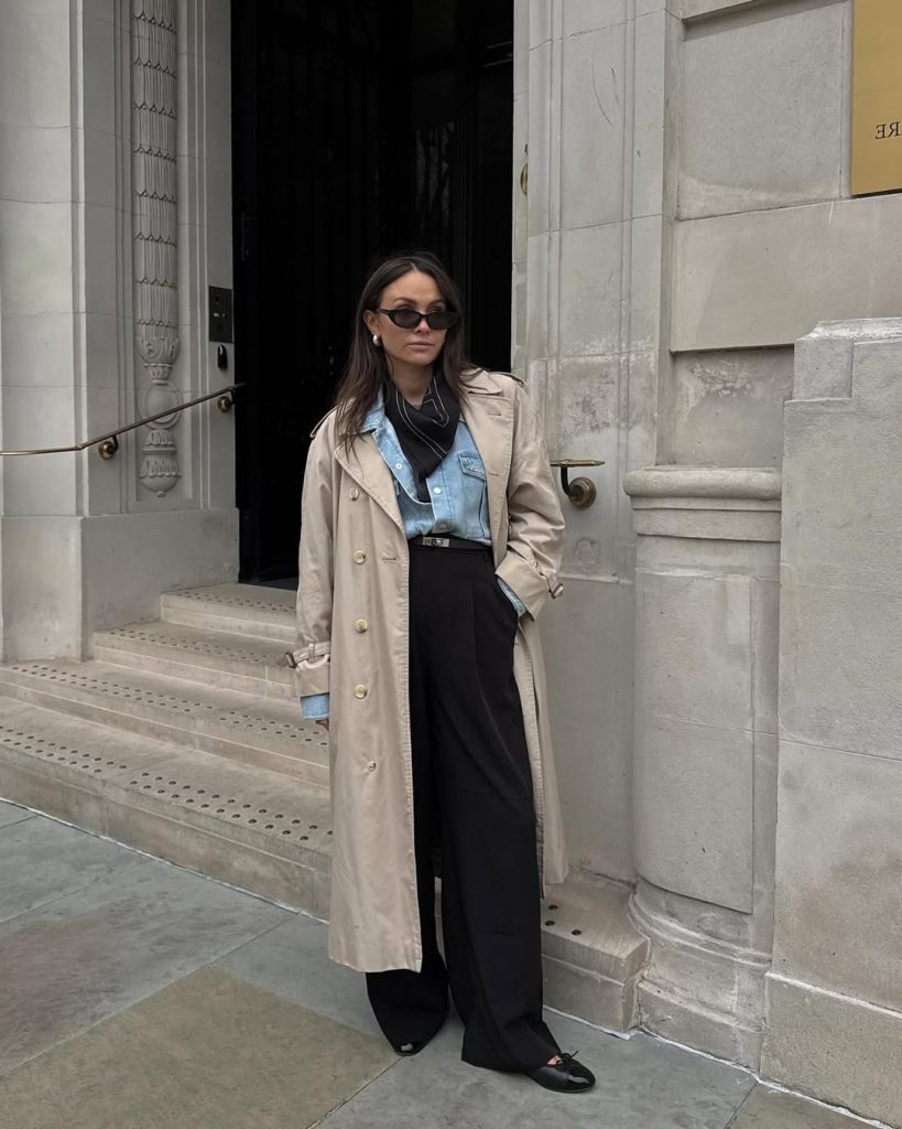 A classic trench layered over denim and black trousers delivers timeless London style—practical, composed, and endlessly wearable.