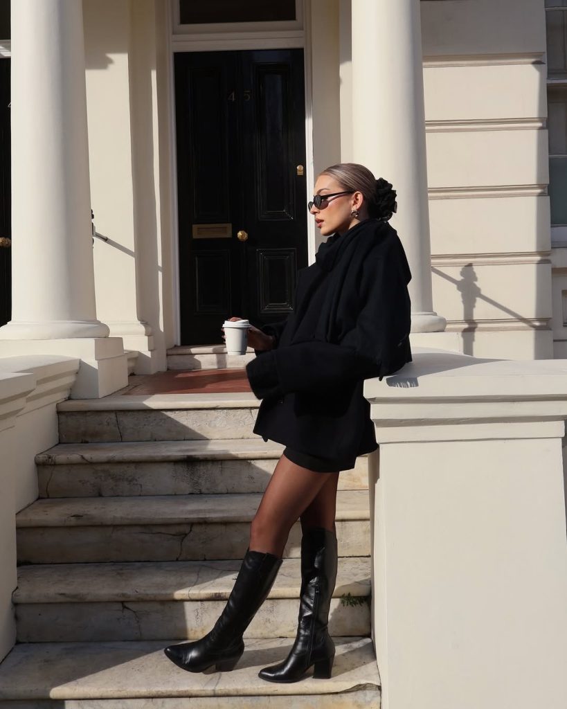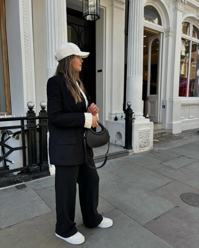 Tailored black pieces meet streetwear ease, proving that London spring style thrives on contrast and confidence.