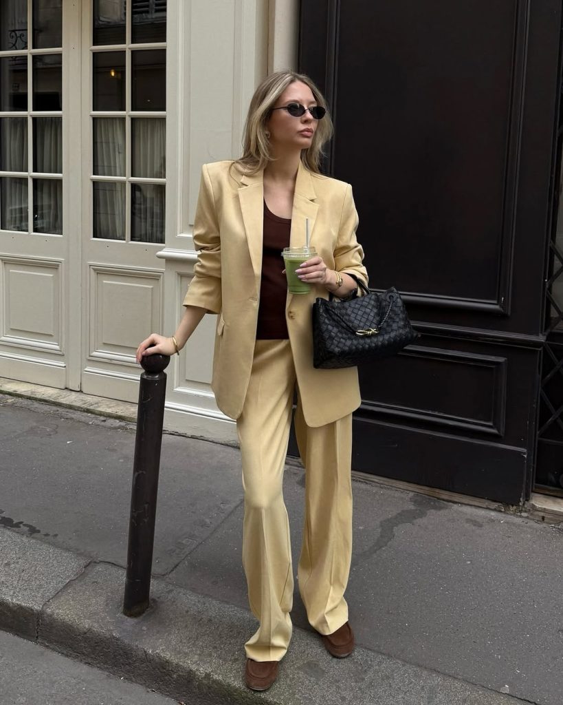 A pale yellow suit feels fresh and modern, offering a softer alternative to neutrals while staying polished.
