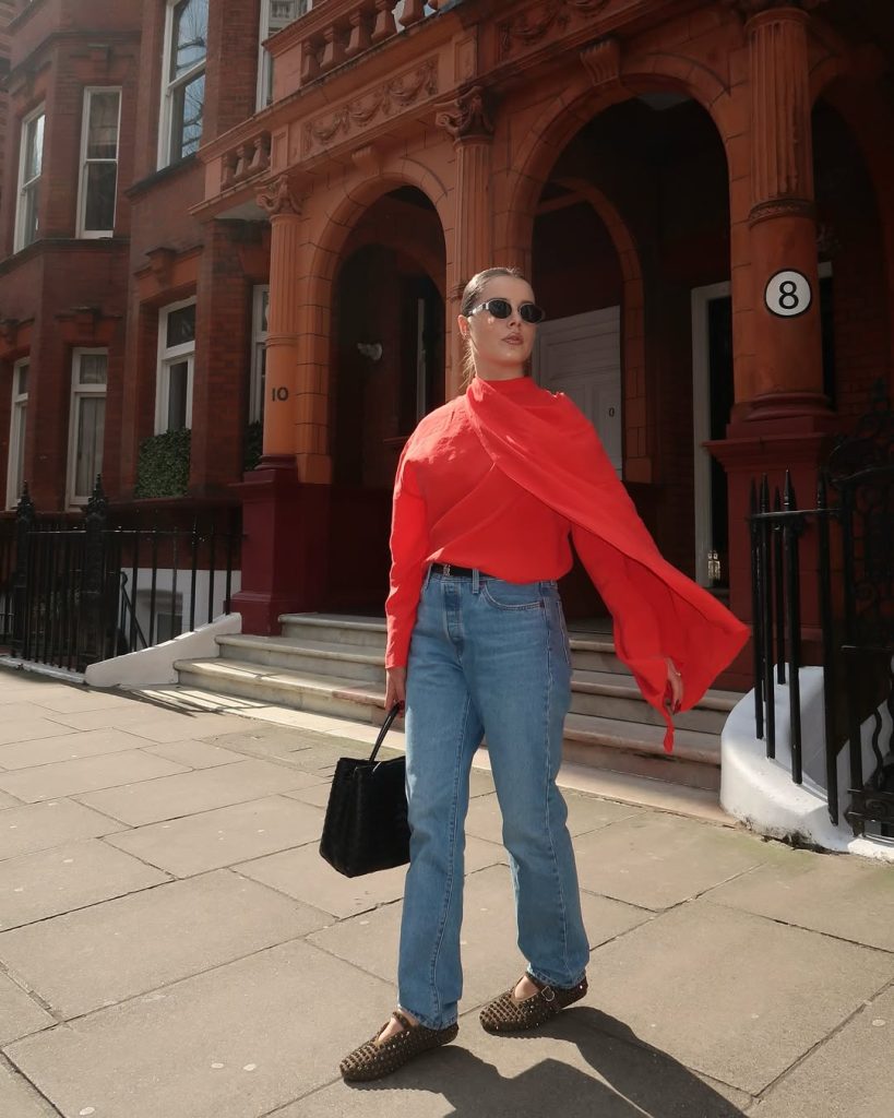 A striking red blouse paired with classic denim captures confident spring energy against London’s historic architecture.