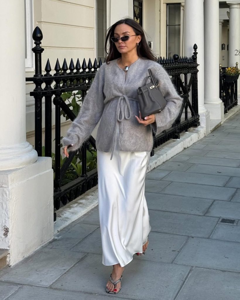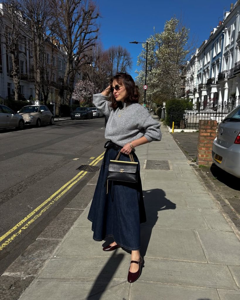 A gray knit paired with a flowing denim midi skirt feels quietly confident—an outfit that moves with ease through a bright London spring afternoon.