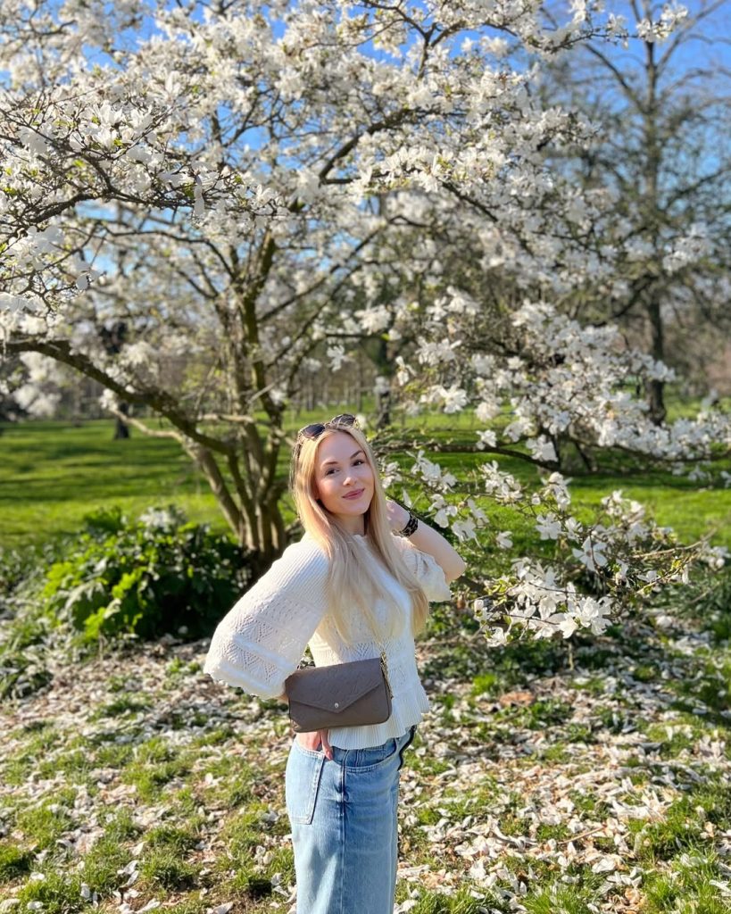 A delicate white knit and classic jeans capture the romance of spring—fresh, simple, and perfectly timed with blooming trees.