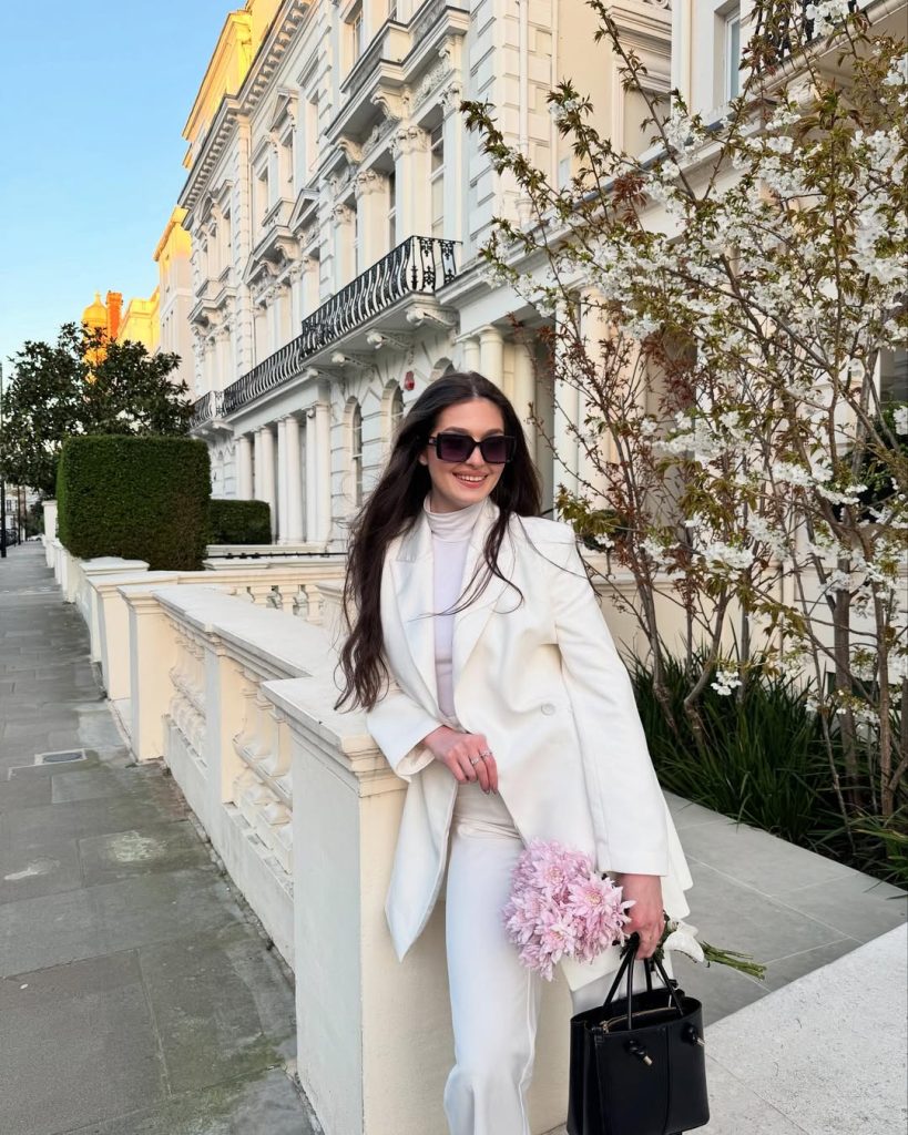 Soft blue and white come together in a look that feels calm, feminine, and perfectly suited to a sunlit London morning.