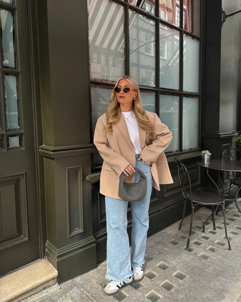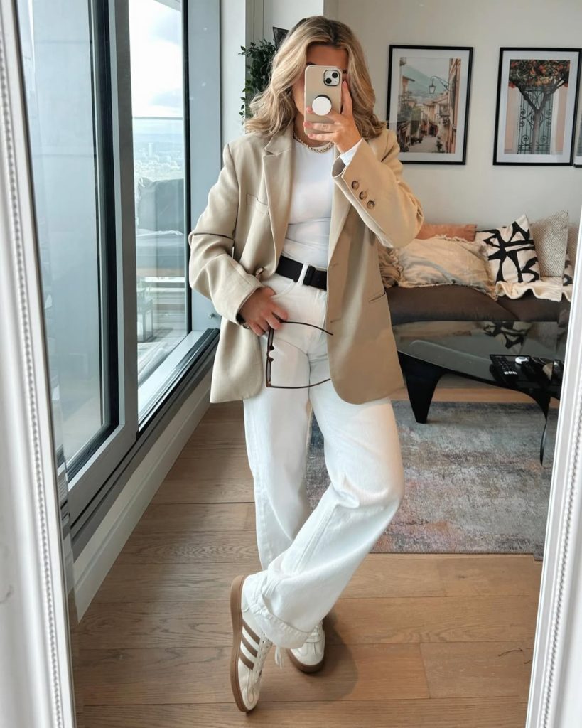 A beige blazer paired with white jeans creates a clean, confident look that feels timeless yet modern—ideal for cool London mornings with a soft café stop in mind.