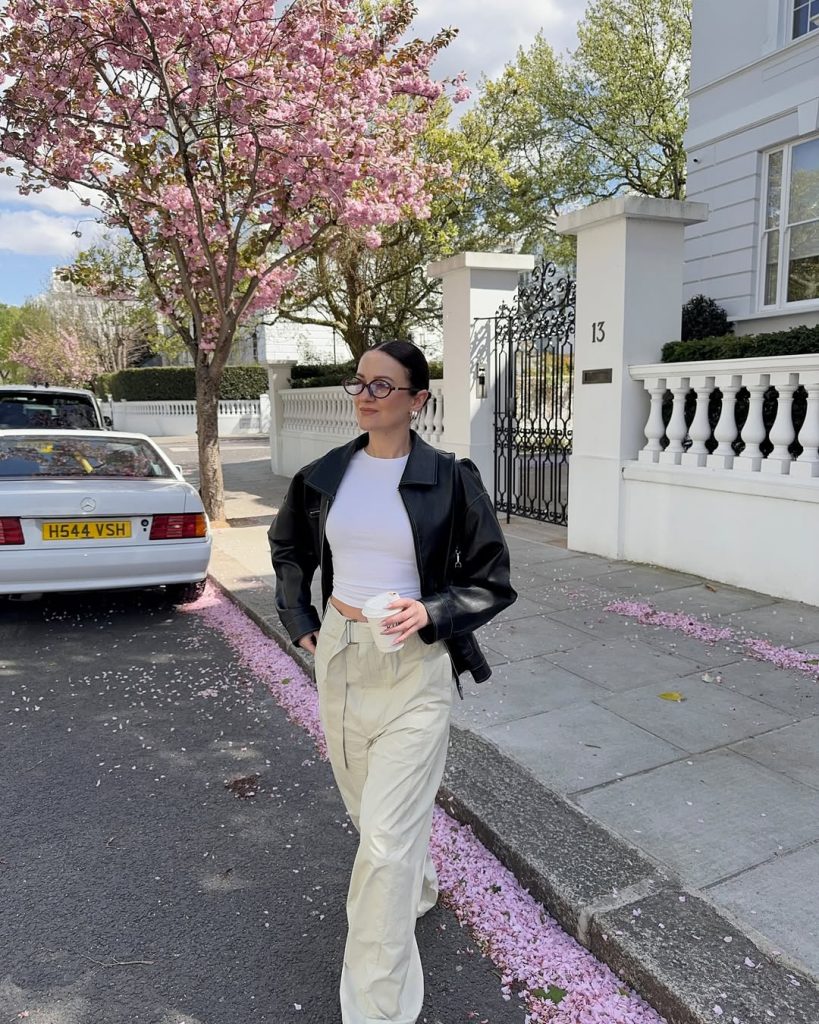 A cropped beige jacket over denim delivers an effortless, youthful look that feels perfectly at home on a quiet London street in spring.