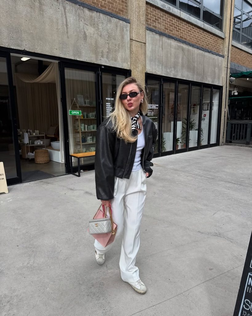 These shoes are perfect for weekend errands, creative meetings, or casual lunches. The leather jacket anchors the look against cold breezes, while light trousers keep it seasonal. Add a canvas tote for daytime, or swap sneakers for loafers for a subtle business casual shift. This look adapts beautifully for pregnant styling with a softer waistband.