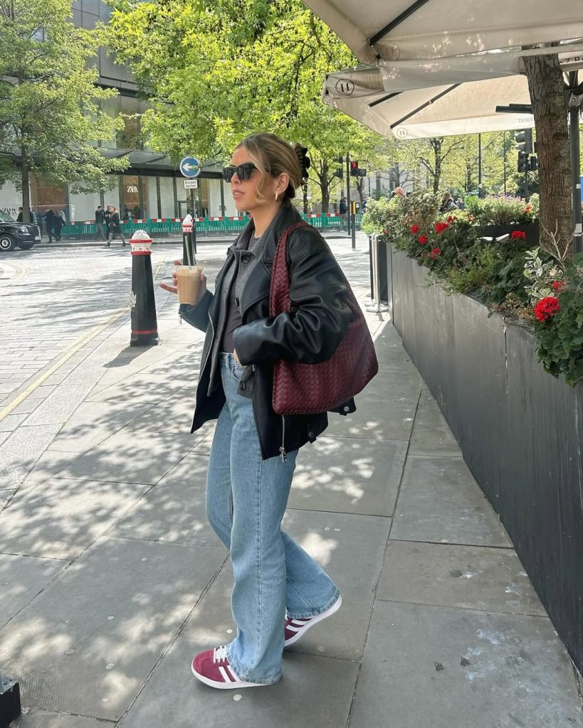 A black leather jacket paired with denim captures London’s off-duty mood—effortless, practical, and quietly cool.