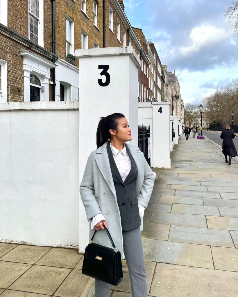 A pale grey coat layered over classic tailoring feels quietly powerful—an elegant answer to London’s cold spring mornings and polished city pace.