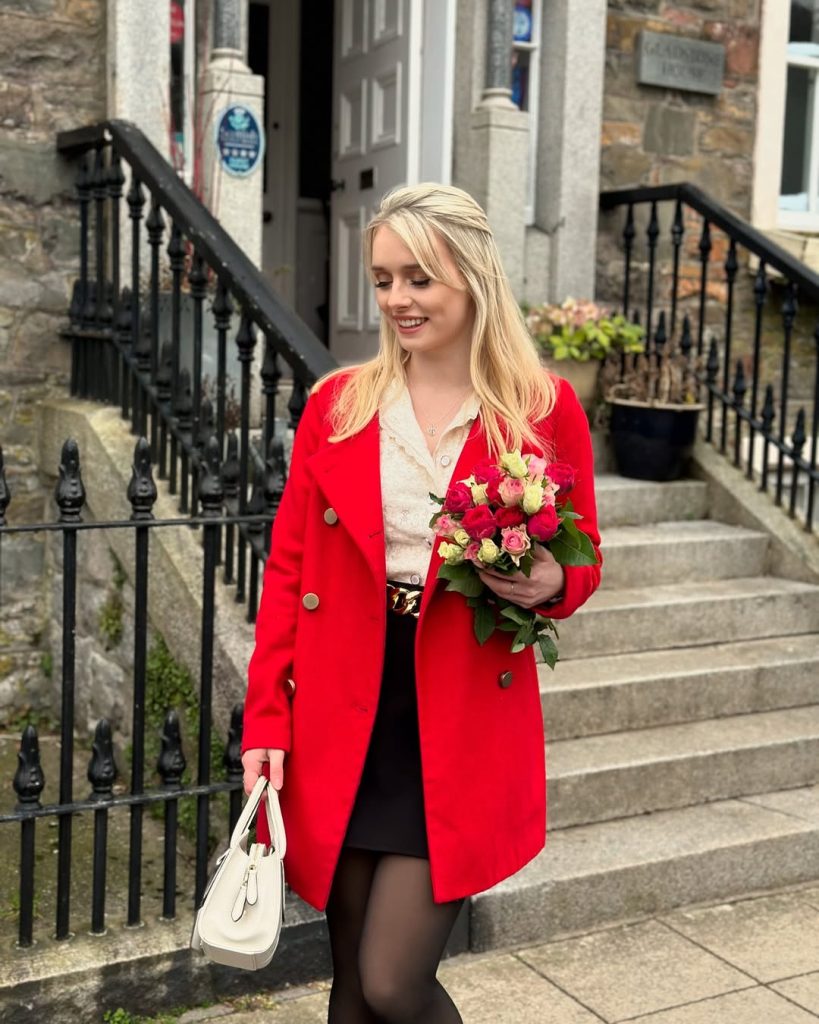 A striking red coat brings drama to classic black layers, proving London spring style doesn’t shy away from confident color.