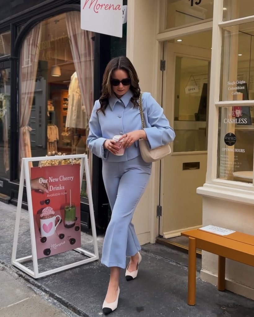 A soft blue matching set feels modern and calm, blending tailored lines with relaxed confidence—perfect for London’s café culture.