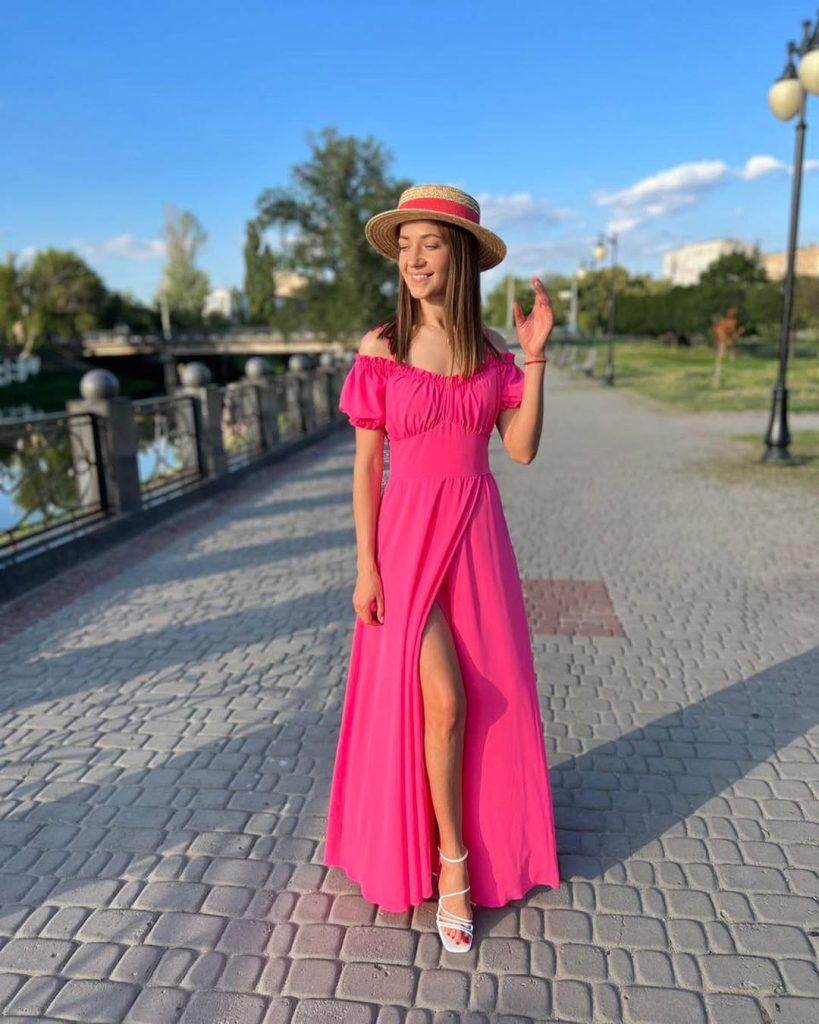 This bright pink maxi dress embodies everything summer and offers pure joy. The off-shoulder design with a soft maxi dress silhouette creates a look that is both functional and romantic. This is perfect for summer days in the city or by the ocean. The side slit offers a breezy silhouette perfect for summertime and ease of movement, especially with a straw hat and sandals.