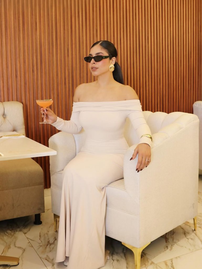 This beige off-shoulder maxi dress feels like quiet confidence embodied. The sleek silhouette, paired with the smooth neutral tone, gives it a minimalist yet powerful charm. Perfect for women who adore a touch of glamour without shouting for attention, this look radiates modern sophistication—the kind you’d wear to brunch or an upscale evening lounge.
