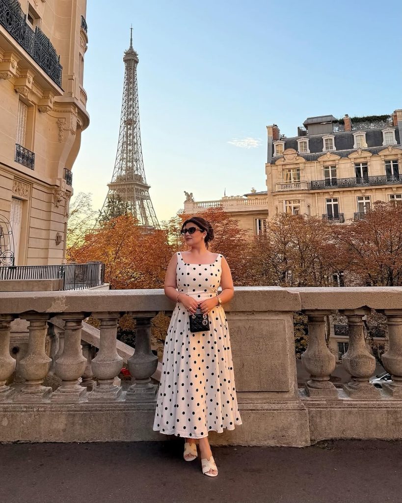 A white polka dot dress adds vintage charm to a modern wardrobe. This one is a mix of playful femininity and Parisian chic—the fitted bodice and flowy skirt are meant to be flattering and fun. It’s joyful for a stroll in the city or a sunny brunch, with a timeless look and cheerful twist.