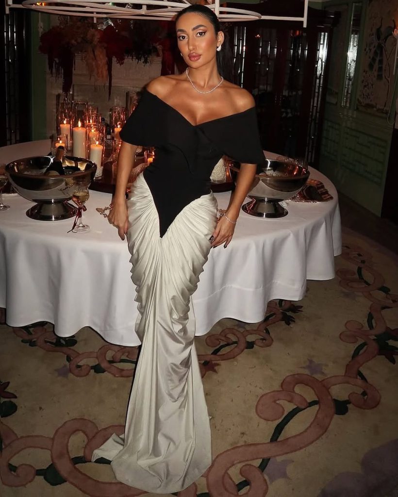 This black and white maxi dress is pure artistry—a sculptural design that blends contrast and movement effortlessly. The ruched cream skirt and structured black bodice create a dramatic, couture-inspired silhouette that’s meant to be noticed. It’s elegant, edgy, and unforgettable.