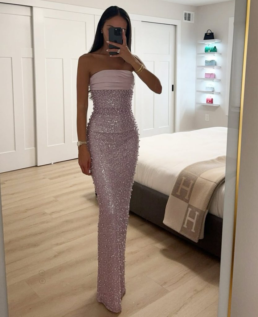 The sparkle of this pink strapless maxi dress instantly lights up any room. The beaded texture catches the light beautifully, giving off that glamorous Hollywood energy. Its fitted silhouette accentuates curves while keeping things polished and graceful, perfect for evening events or special celebrations.