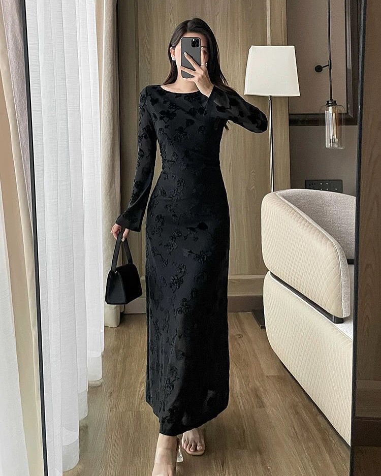 Subtle, elegant, and timeless—this black velvet maxi dress is the epitome of understated luxury. The delicate floral pattern adds texture, while the fitted long-sleeve cut makes it suitable for cooler seasons. It’s refined enough for formal dinners yet versatile enough for evening outings.