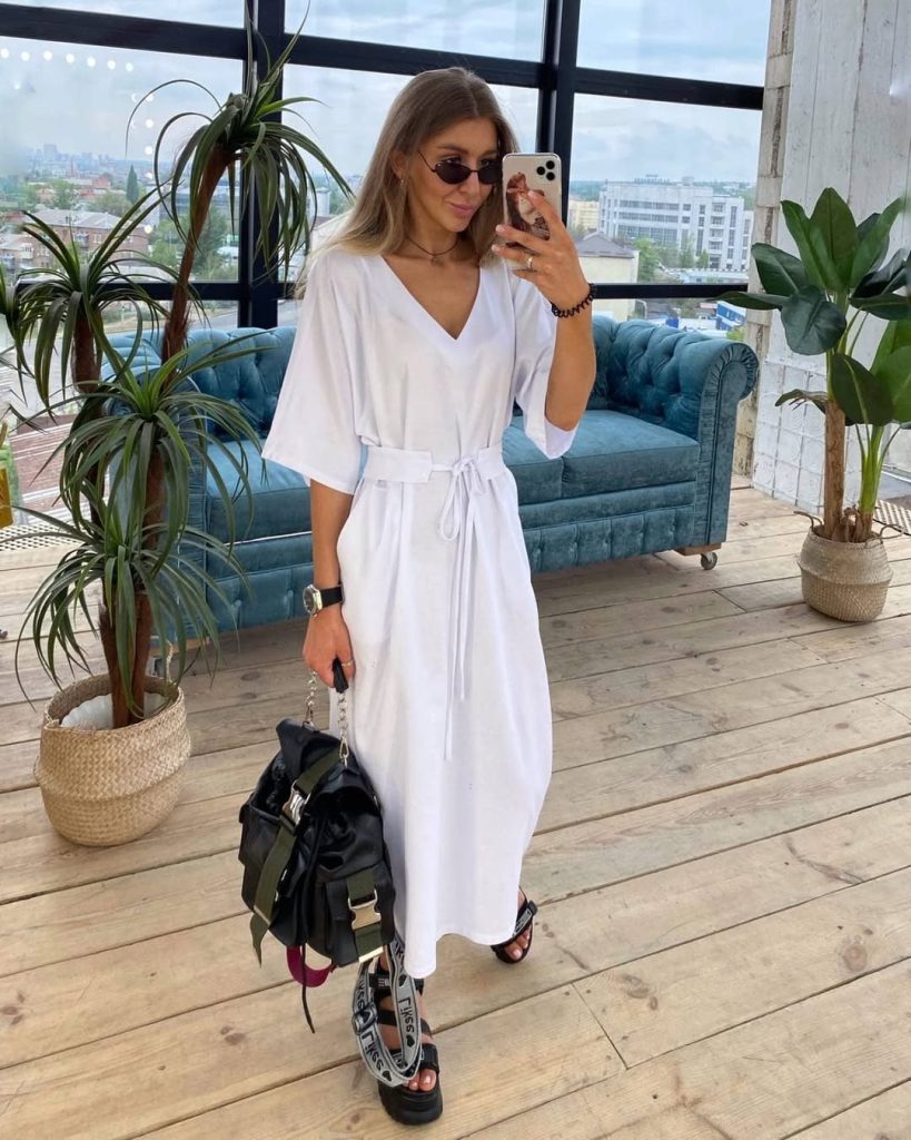 This relaxed white maxi dress is proof that comfort and style can coexist. The belted waist defines the figure without feeling restrictive. The soft V-neck and wide sleeves give it a breezy, modern feel. Styled with platform sandals and a backpack, it’s perfect for exploring new cities or casual weekend vibes. The combination is the ultimate blend of boho and streetwear.
