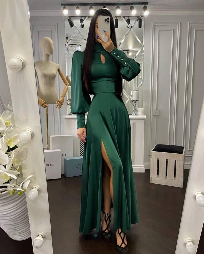 This emerald green maxi dress is the definition of refined glamour. The satin finish and high neckline give it a regal aura, while the long sleeves and thigh-high slit add balance between sophistication and sensuality. It’s the kind of statement piece that captures attention in an instant—graceful, strong, and unforgettable.