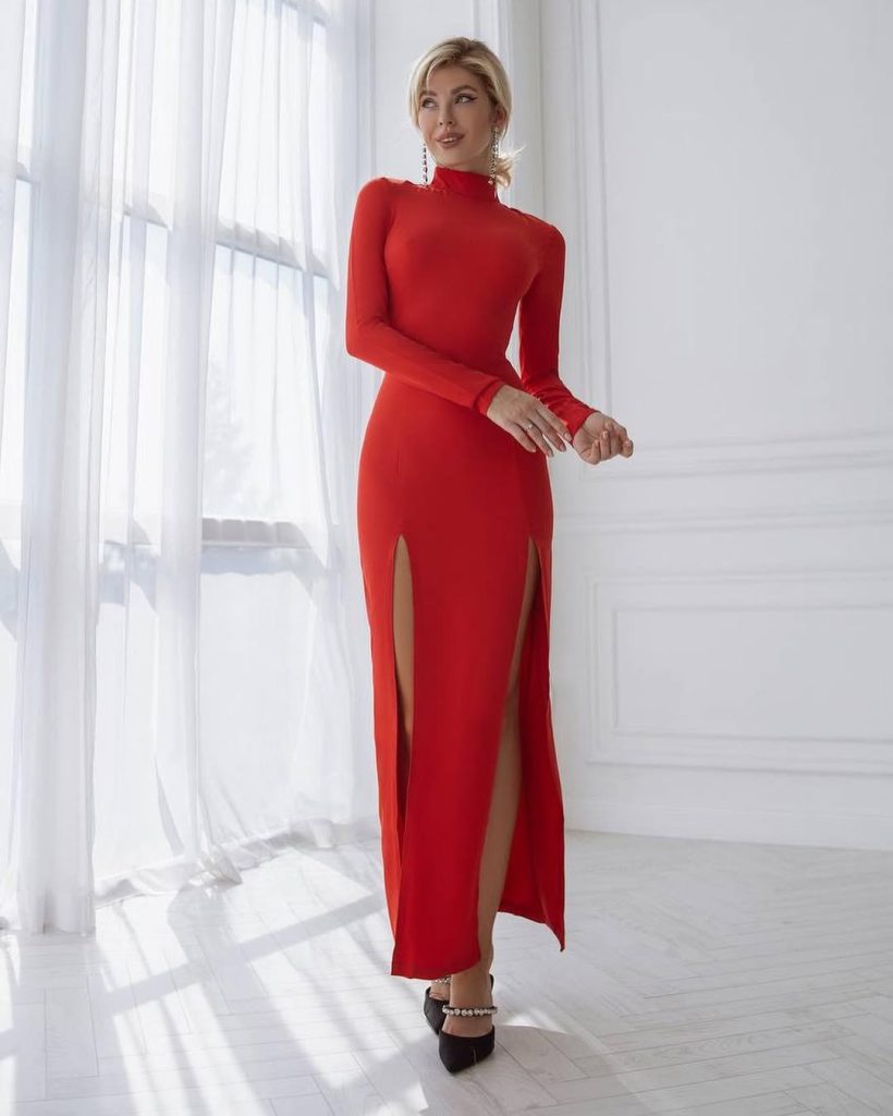 There’s something magnetic about a bold red maxi dress—it radiates confidence, charm, and that timeless allure that turns heads without even trying. This piece blends sophistication with a daring twist thanks to its sleek long-sleeve cut and twin high slits that add just the right touch of drama. It’s the kind of outfit that makes you feel unstoppable, perfect for a dinner date or an elegant evening in the city.