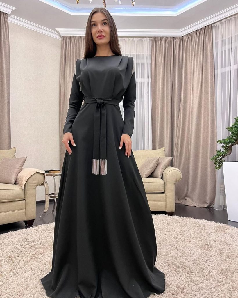 Understated elegance never goes out of style, and this long black dress is a perfect example. The fabric softly cascades with a satin-like finish, and its simple lines, along with the sash, construct a timeless silhouette. It’s the type of dress that whispers confidence and refinement and is a perfect choice for formal dinners or evening gatherings when you want to make an impression quietly.