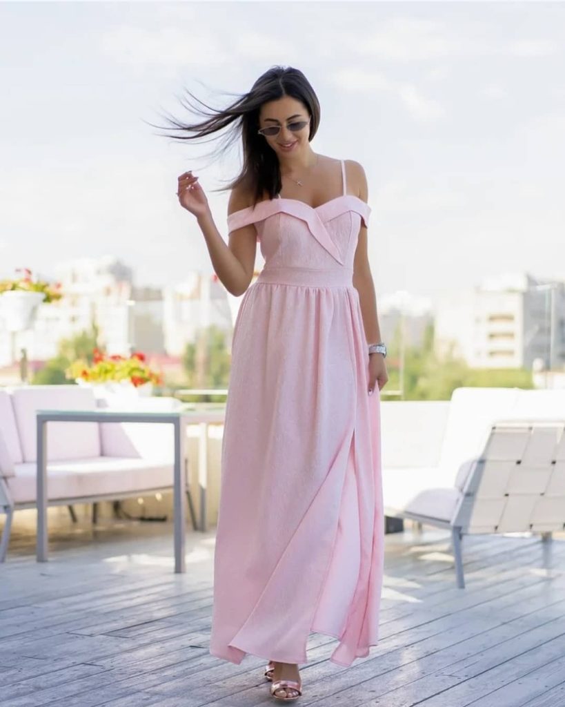 Romantic and effortlessly feminine, this pink maxi dress captures the lightness of summer air and the charm of boho simplicity. The off-shoulder neckline and soft fabric create a dreamy, flowy silhouette that sways beautifully as you walk. Whether you’re attending a brunch, garden wedding, or seaside stroll, it’s the kind of outfit that makes you feel quietly radiant.