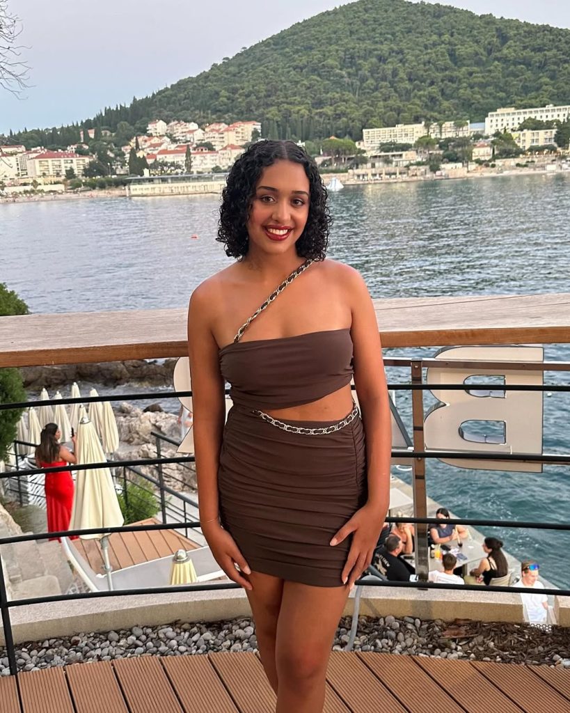 A fitted Brown one-shoulder mini with chain details brings sleek, confident energy to a seaside night out.