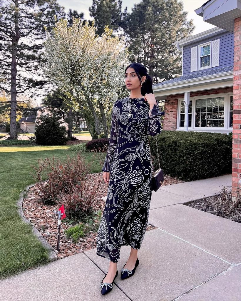 A black-and-white patterned maxi dress balances bold design with timeless restraint.