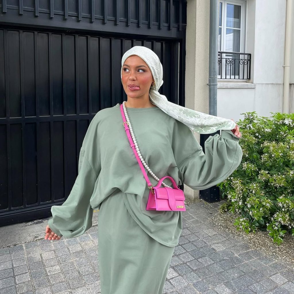 A monochrome sage ensemble feels relaxed yet intentional, elevated by a pop of color that adds personality without breaking modest balance.