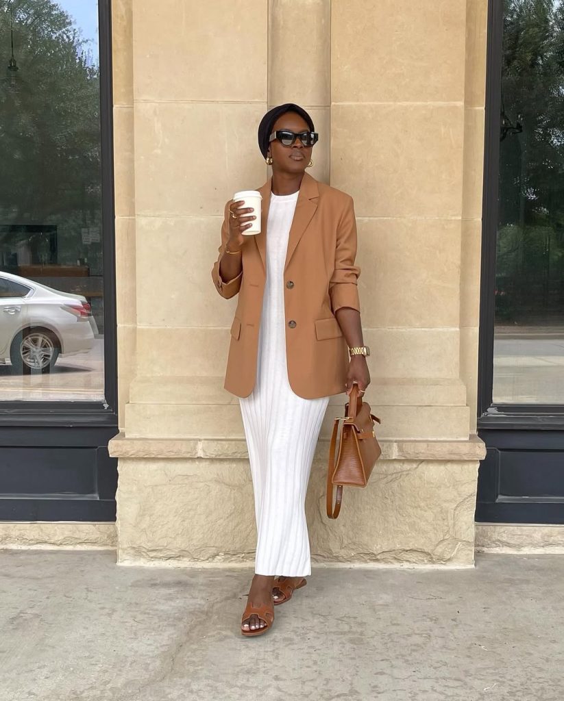 Crisp neutrals meet soft tailoring in a look that feels quietly powerful, polished, and endlessly wearable.