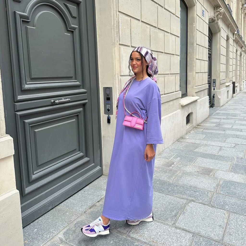 A relaxed lavender dress brings athletic comfort into modest fashion, blending streetwear ease with feminine softness.