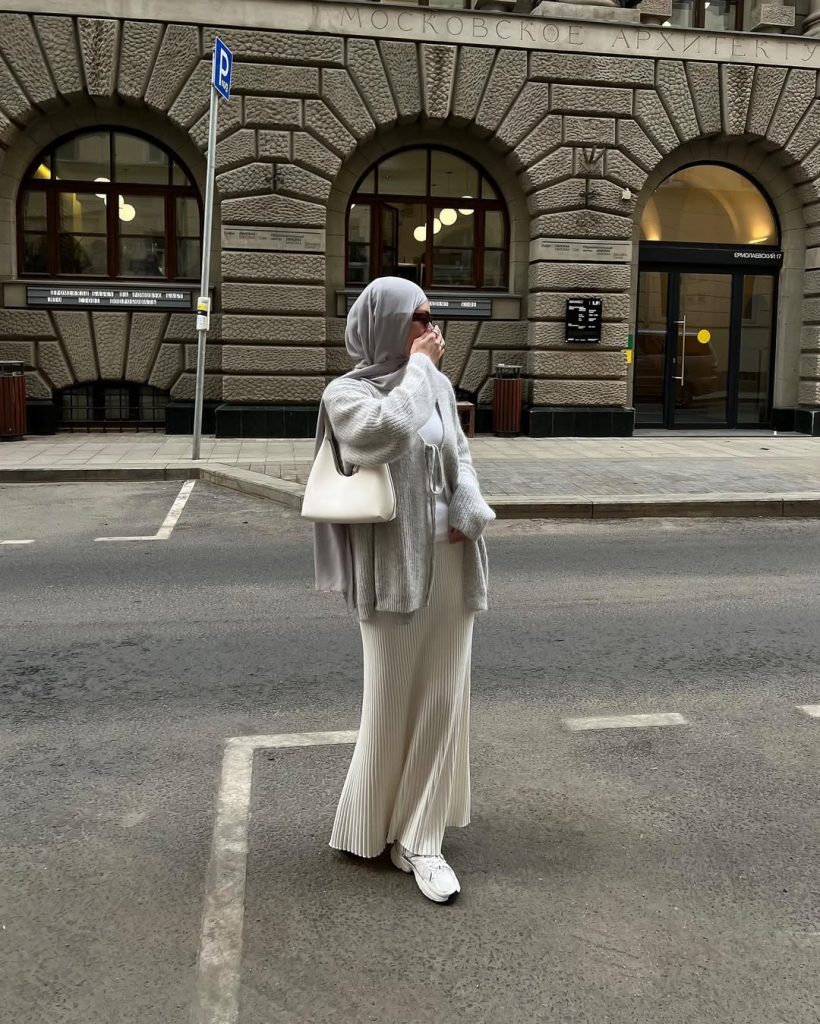 Soft textures and neutral layers create a calm, composed outfit that feels thoughtful and quietly stylish.