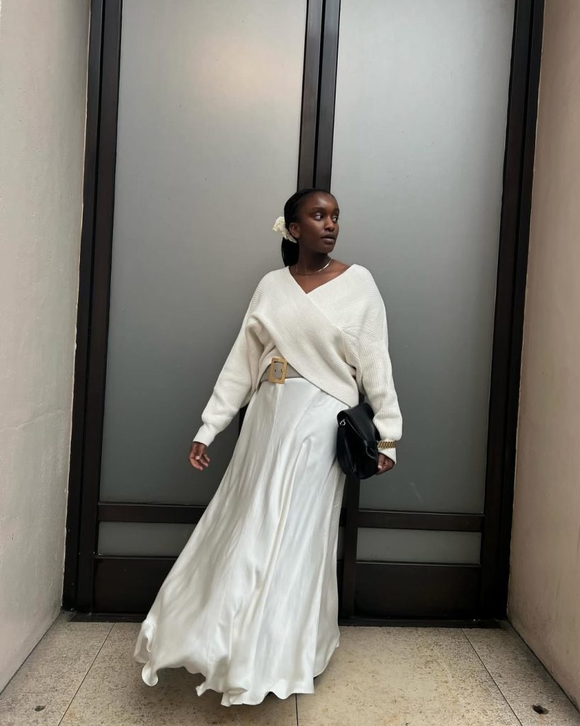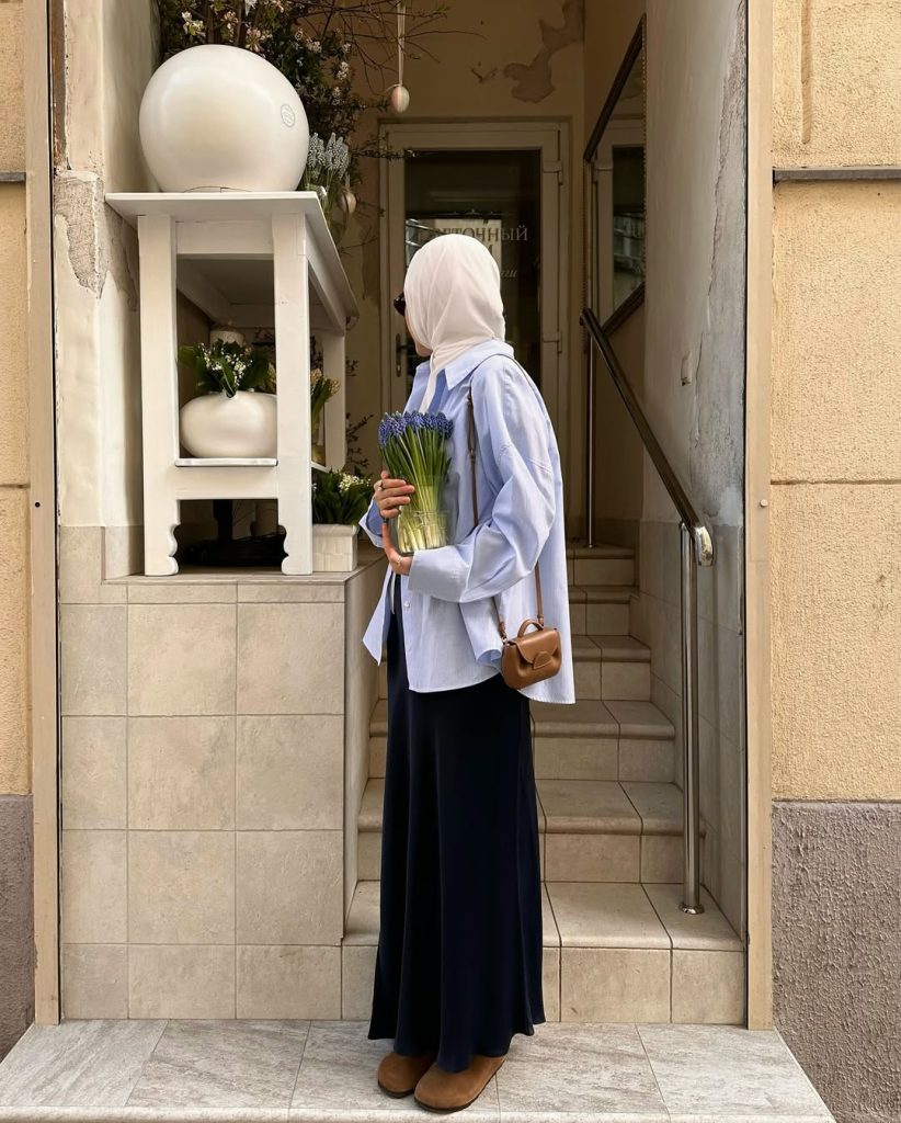 This clutch bag is perfect for occasions such as dinners, intimate gatherings, or church events. This outfit highlights how modest silhouettes can still feel expressive. Add heeled boots or flats depending on the occasion. Avoid oversized outerwear—the movement of the skirt deserves to remain visible as the focal point of this elegant spring inspiration.
