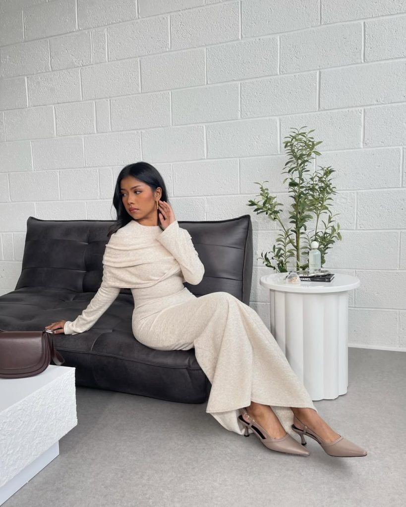 A fitted, neutral dress creates a refined silhouette that feels polished, calm, and effortlessly classy.