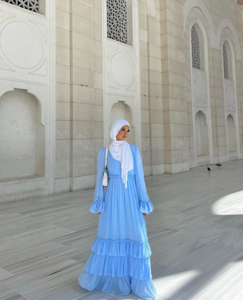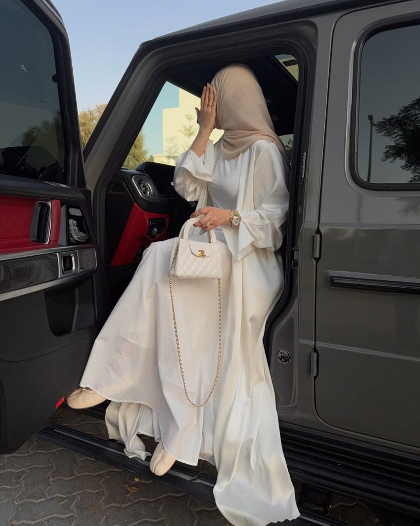This look instantly communicates calm confidence and refined elegance. The flowing white abaya creates a soft, sculptural silhouette that feels both graceful and powerful.