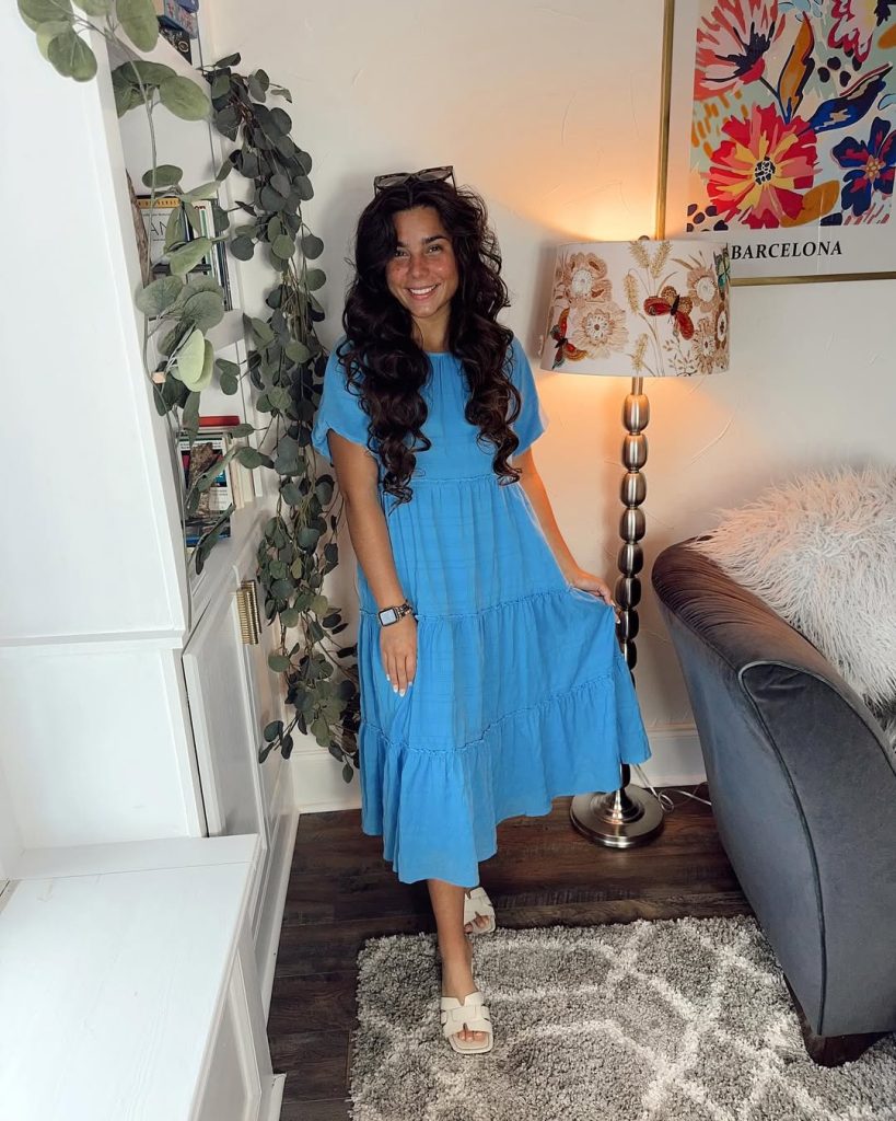 A soft blue midi dress brings warmth and ease, creating a look that feels welcoming, relaxed, and genuinely lived-in.