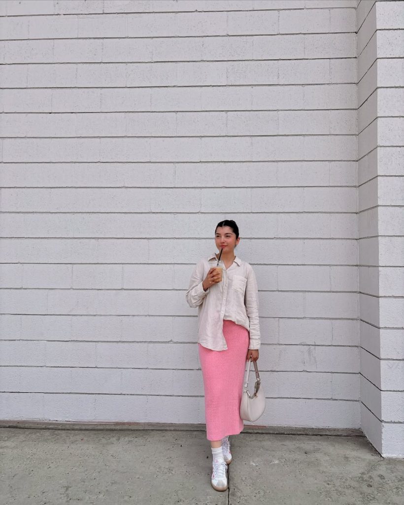 This outfit is perfect for casual spring days, walks, or relaxed meetups. The pink skirt adds warmth without overpowering the look. Keep styling minimal—this outfit thrives on simplicity and natural movement, making it an effortless inspo for everyday wear.