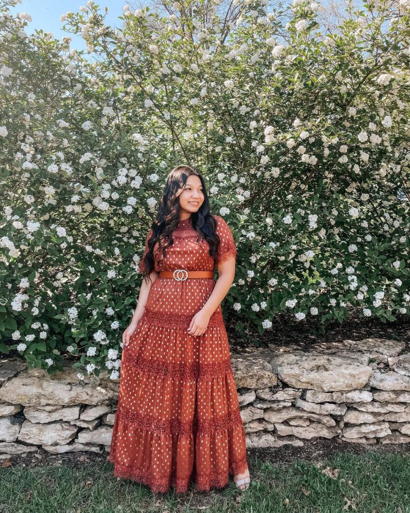 - Rust-toned maxi dress with subtle dotted pattern