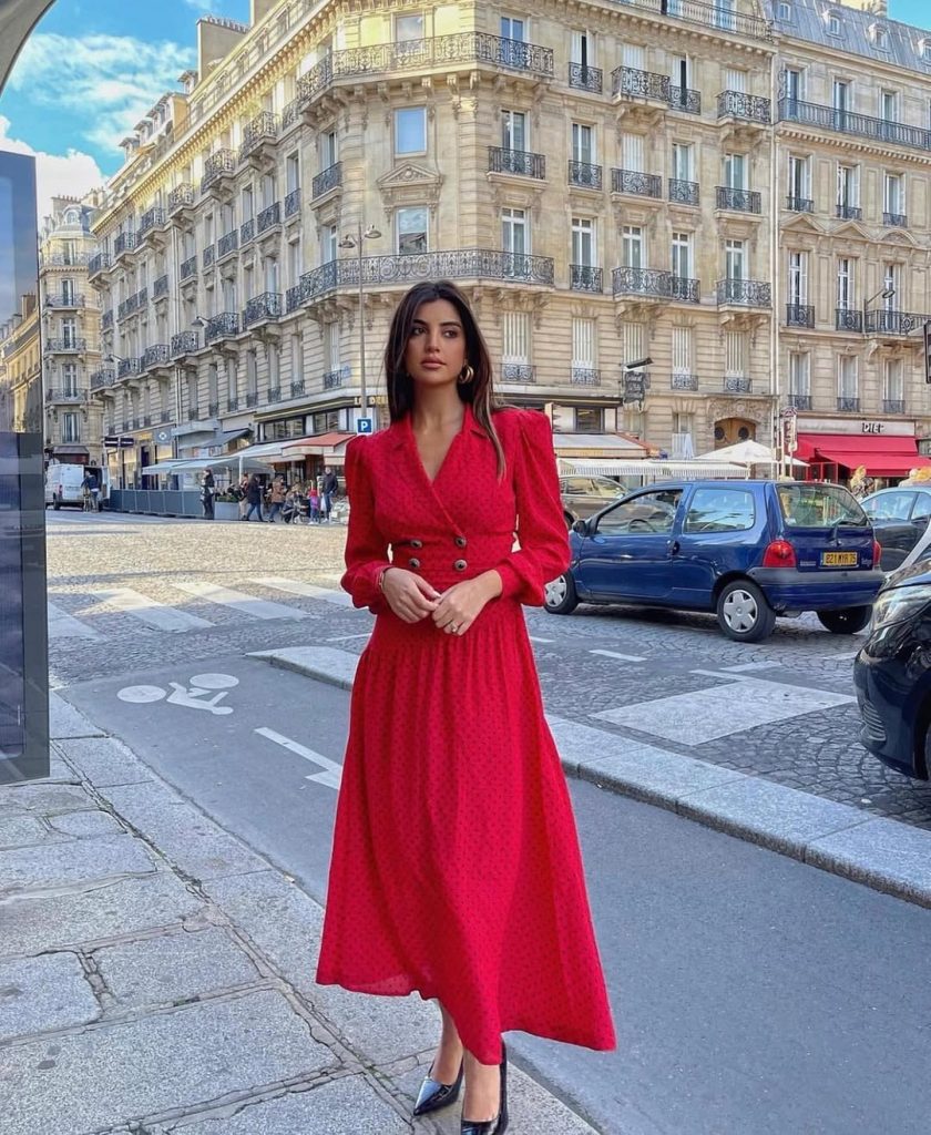 A red midi dress channels European refinement, offering a striking yet modest silhouette that feels confidently elegant.