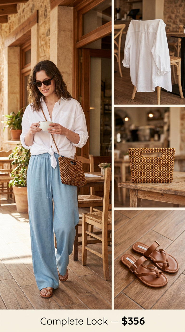 This outfit appeals to travelers and resort-goers who prioritize both comfort and aspirational style. The serene palette of crisp white, sky blue, and warm natural wood tones creates visual cohesion that photographs beautifully and translates across multiple summer venues. Tortoiseshell-framed sunglasses from Sunglass Hut ($152.80) anchor the look with timeless sophistication.