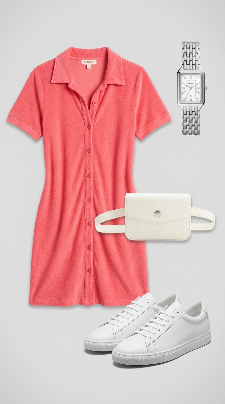 The Sundry polo dress in vibrant coral piqué cotton ($158) is tailored to flatter without clinging, creating a polished silhouette ideal for daytime events. Its structured piqué weave resists wrinkles and maintains shape through extended wear. Pair it with a white vegan leather belt bag ($60) that stays secure and comfortable during 3-hour country club walks—the vegan material requires minimal maintenance compared to traditional leather. A silver stainless steel watch accessory ($195) adds sophistication without bulk.