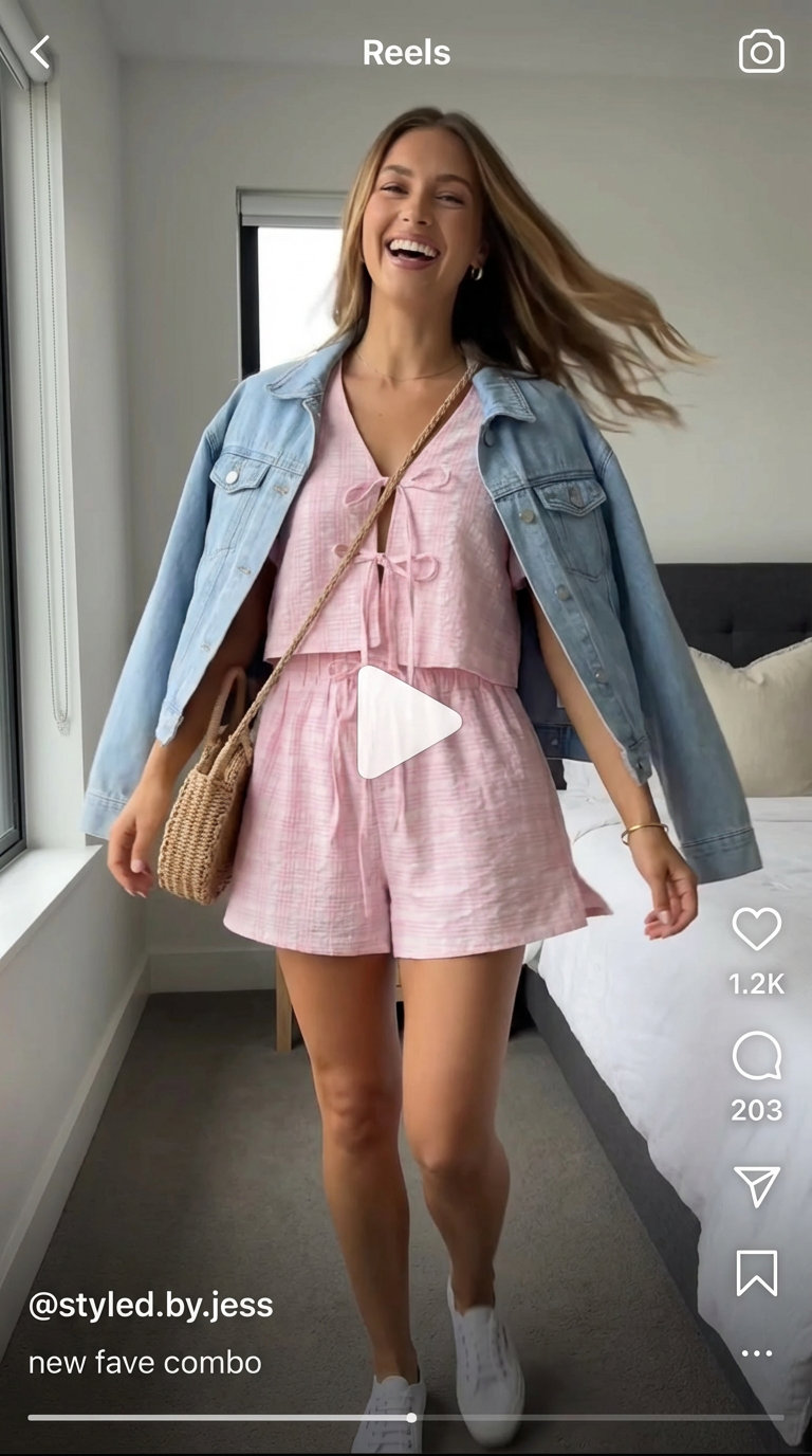 This pastel pink plaid matching set from Poshmark serves as the perfect hero piece for an outdoor picnic, priced at $60. The cotton blend fabric keeps you comfortable in warm weather while maintaining a polished, put-together look. Paired with classic white canvas sneakers at $49, the outfit grounds itself in practicality without sacrificing style. A light blue denim jacket layers effortlessly over the set, adding casual cool, while a natural straw crossbody bag from Etsy at $39.99 ties the palette together with bohemian charm. A subtle gold bracelet catches the light, completing the aspirational yet achievable aesthetic that makes this look highly savable.