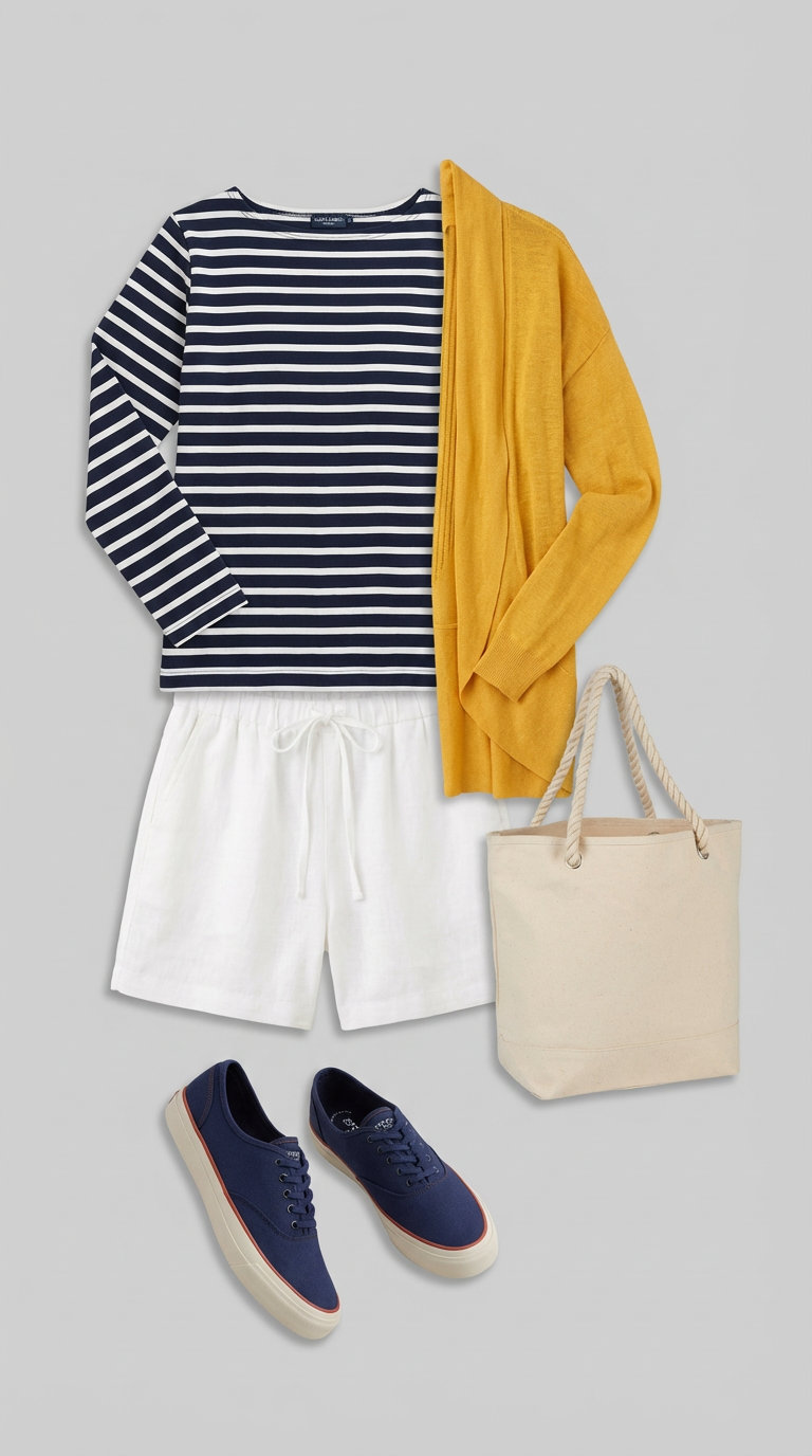 Marine Layer’s white linen drawstring shorts at $52 deliver comfort and a relaxed fit perfect for warm-weather waterside activities. Linen naturally breathes and develops character with wear, creating an effortlessly lived-in aesthetic that feels both nautical and refined. Layer this with a bright mustard-yellow cotton knit sweater at $24.97 from eBay—tie it around your shoulders as the day cools, adding a visual pop without bulk. The navy and white striped base provides a crisp foundation that anchors the warm yellow accent and white canvas sneakers at $59.99, which grip wet surfaces and offer comfort during waterside activities.