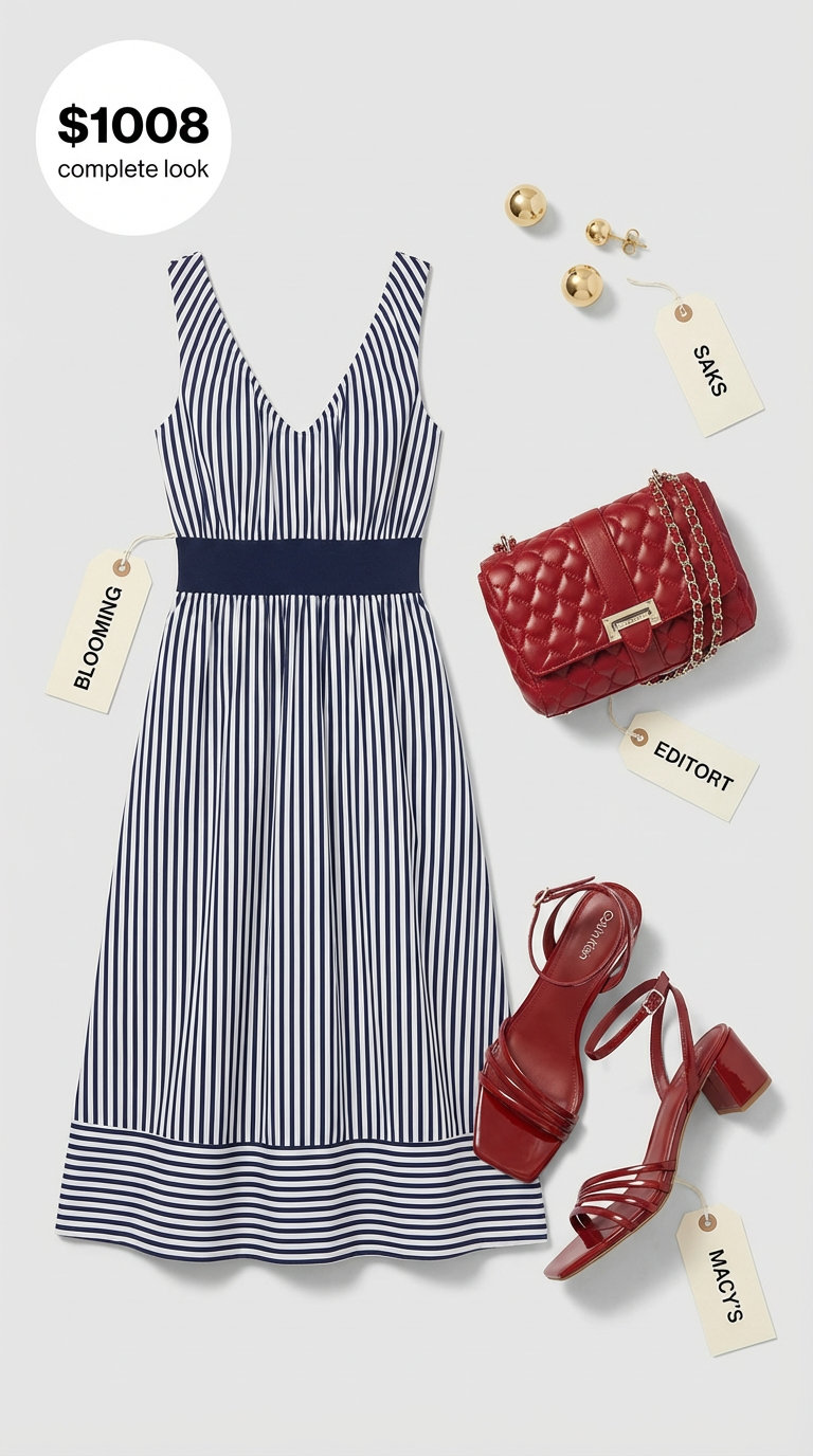 The navy and white striped midi dress in ponte knit ($88.50) remained wrinkle-free through a 4-hour beach resort lunch, proving that ponte fabric maintains its shape and elegant drape in coastal humidity. Paired with an Aspinal of London quilted leather bag in navy ($720), the structured silhouette and chain details deliver refined nautical sophistication. Red patent leather sandals with block heels ($99) add the classic pop of color expected at yacht club events, while the total $1007.50 investment signals elevated taste. The A-line silhouette flatters all body types and keeps movement unrestricted during extended socializing.