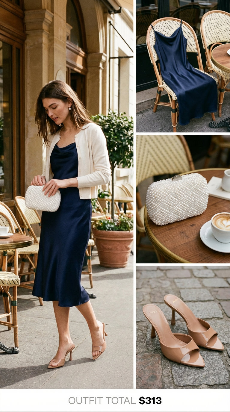 A navy satin slip dress becomes evening-ready layered under a cream viscose cardigan—the sleek silhouette and soft knit fabric work together to balance sophistication with ease. The $49.99 dress plus the $23.99 cardigan anchors the look. A pearl faux-leather clutch and nude patent slides elevate the palette without fuss, proving refined elegance doesn’t require complexity or excessive price tags.
