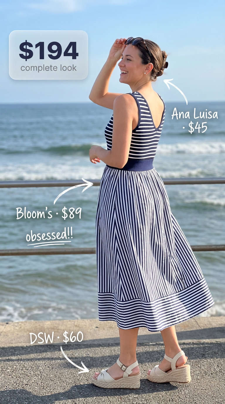 A navy-and-white striped cotton-knit midi dress anchors this outfit with timeless nautical elegance and universal flattery. The A-line silhouette skims the body without clinging, and at $88.5, it’s an accessible entry point to relaxed luxury styling. Cotton knit holds its shape well in humid seaside settings and breathes naturally through long brunches.